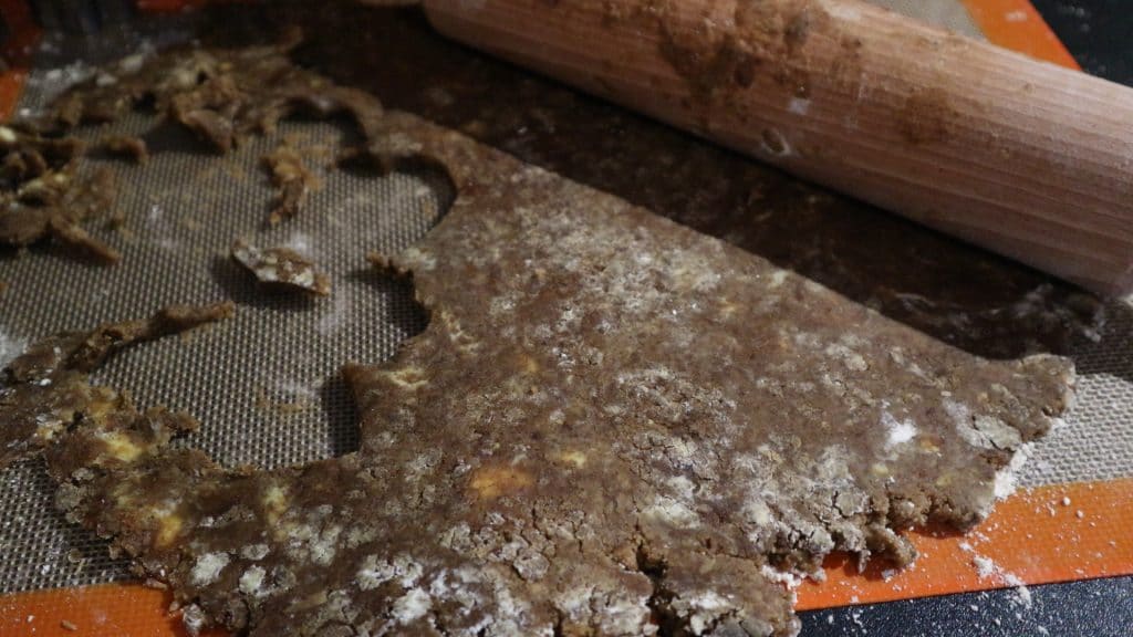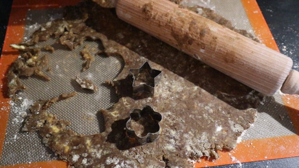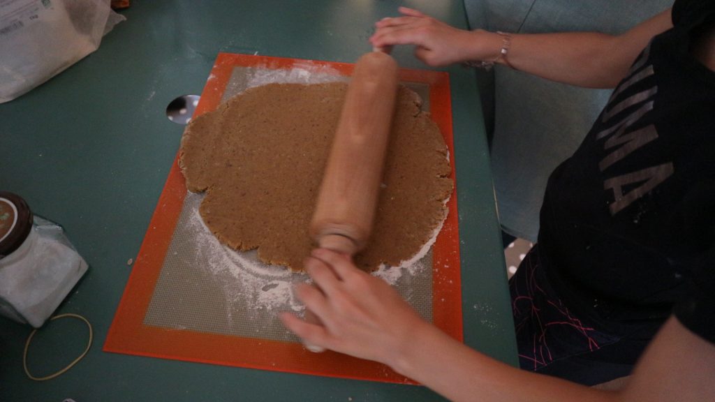 - Puis étaler la pâte au rouleau et on découpe des formes pour créer les sablés.