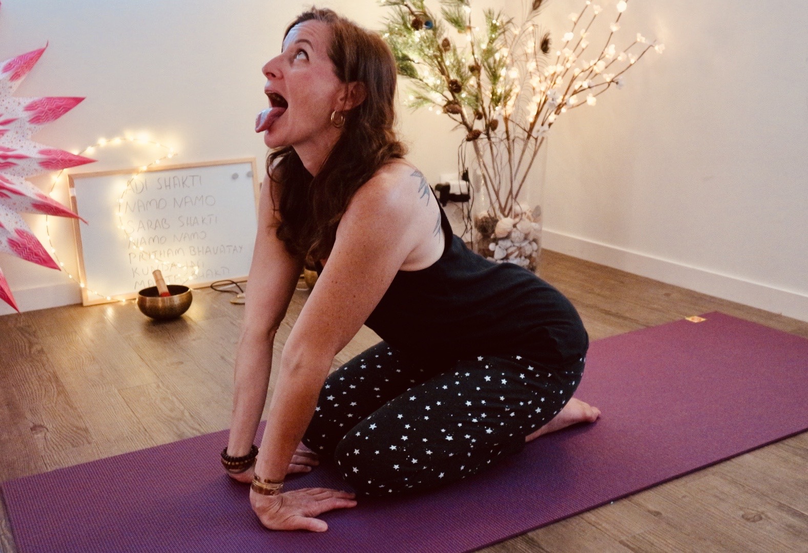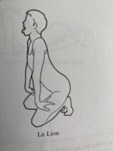 Assis dans la position de Vajrasana (= posture du Diamant), les fesses sur les talons, les mains posées devant les genoux, ou sur les cuisses (ces deux variantes sont possibles), les doigts tournés vers soi, on lève le menton le plus loin possible vers l’avant, puis on lève les yeux vers le haut, en visant un point entre les sourcils (impossible de ne pas loucher,  donc 😉), on ouvre la bouche et… on tire la langue en la poussant le plus loin possible vers l’avant en prononçant  un long Hâââââ fort et clair.